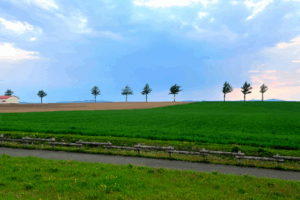 メルヘンの丘は女満別空港から車で10分で着く、国道39号線沿いの観光スポットです。ジャガイモ畑や麦畑の丘の上に、木が等間隔で並んだ幻想的な景色が楽しめます。黒澤監督の映画の撮影地にもなりました。写真撮影のベストシーズンは6〜7月です。