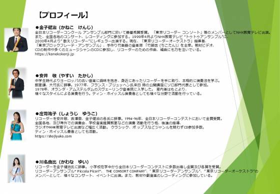 毎年お越しいただいてるリコーダー奏者4人をお迎えいたします