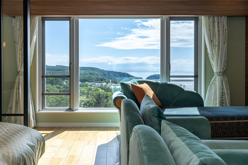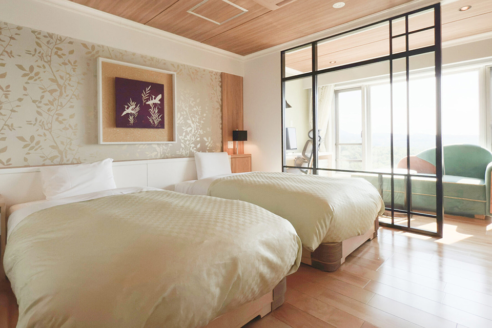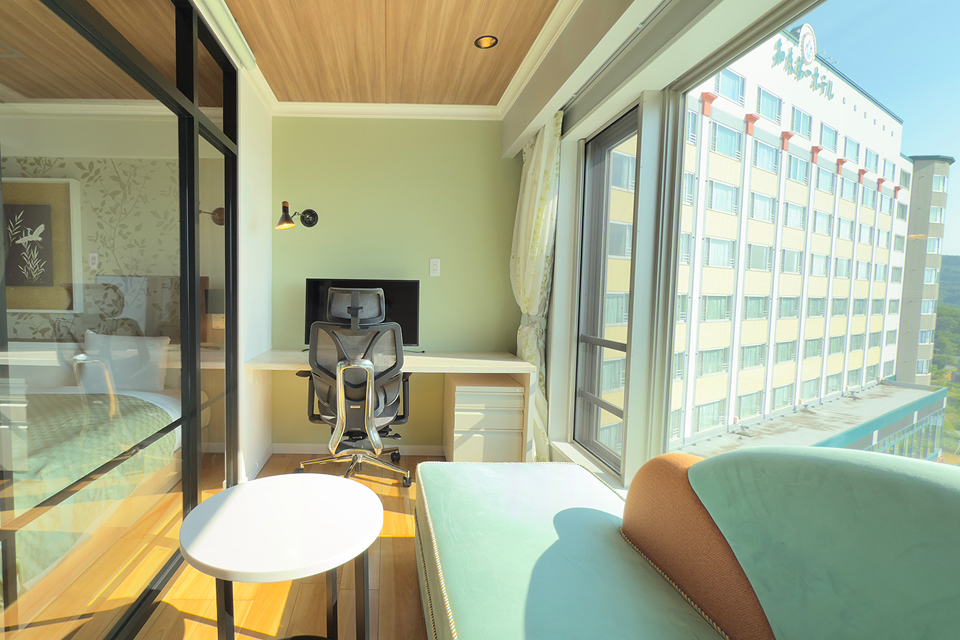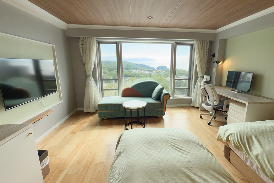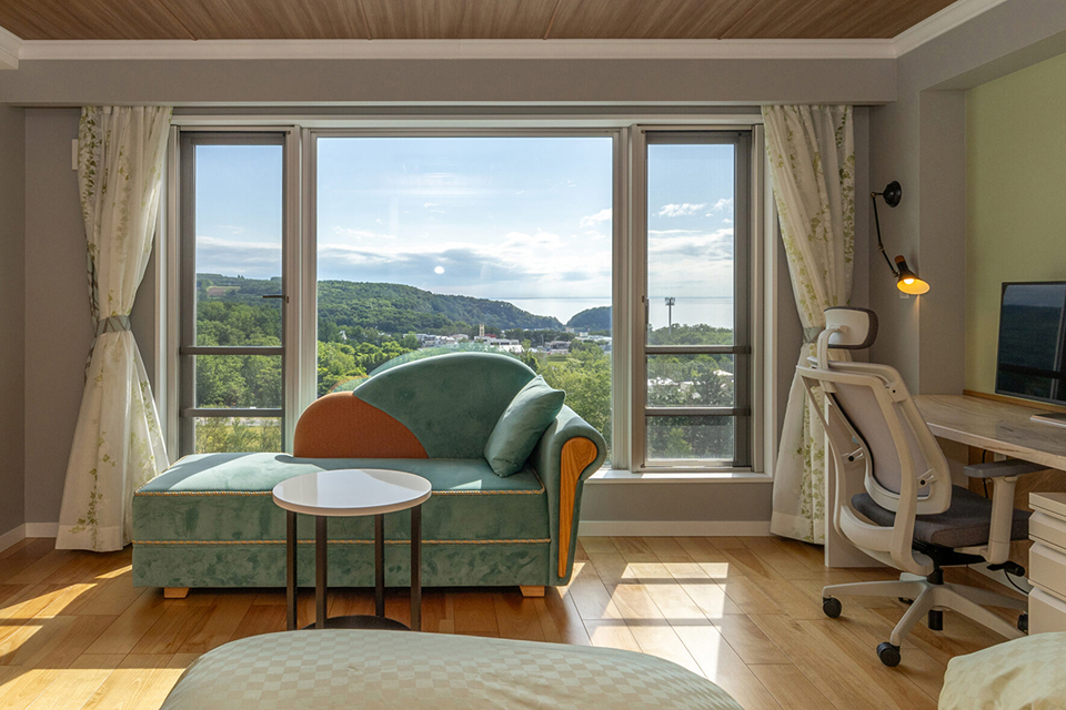 窓際にワーキングスペースを備えたコーナーデラックスルームなら、仕事の合間もオホーツクの絶景で気分転換。