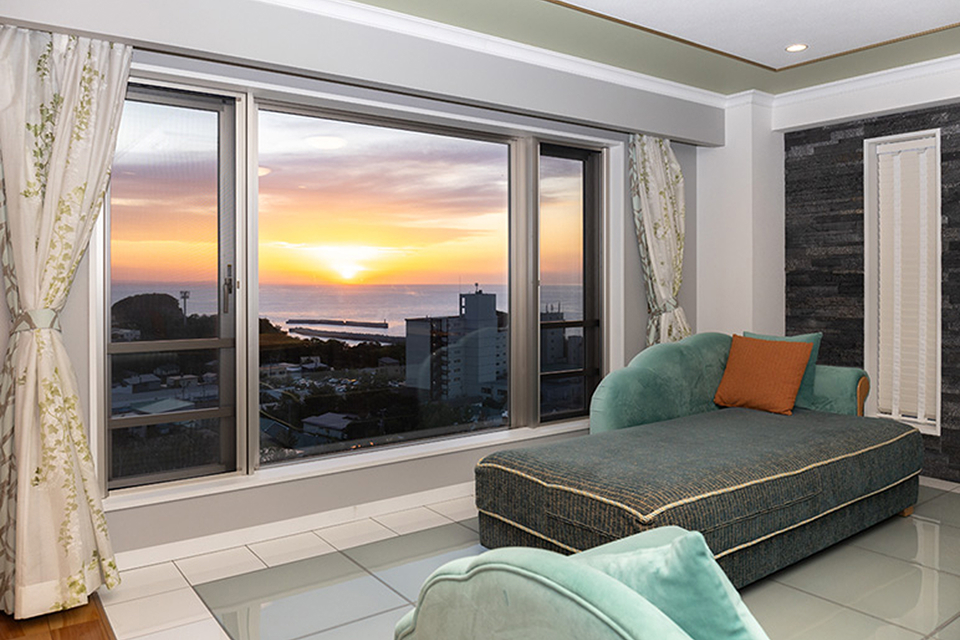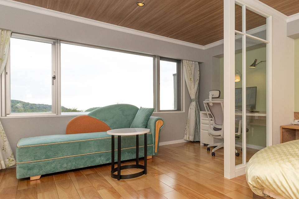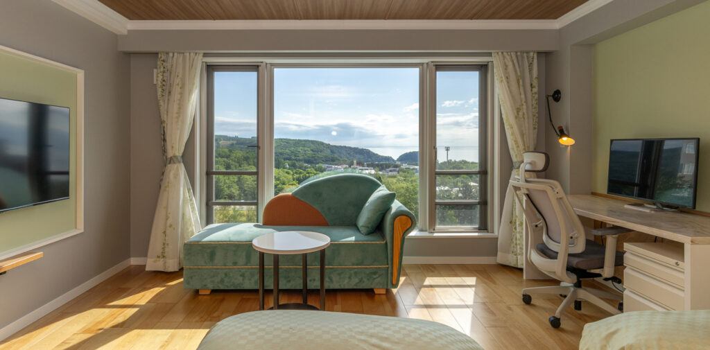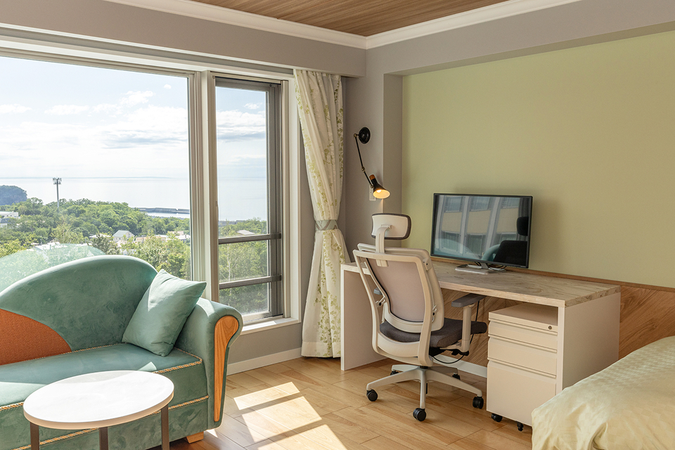 窓際にワーキングスペースを備えたコーナーデラックスルームなら、仕事の合間もオホーツクの絶景で気分転換。